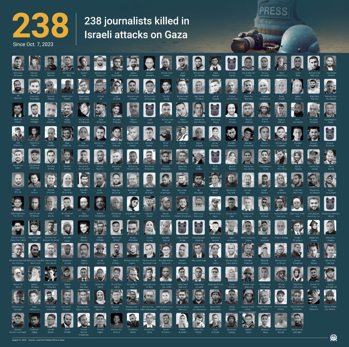 Según los datos de Reporteros Sin Frontera, más de 210 periodistas han sido asesinados por el ejército israelí en la Franja de Gaza en casi 23 meses de operaciones militares de Israel en el enclave palestino. Entre ellos, al menos 56 han sido blanco deliberado del ejército israelí por ser periodistas o han fallecido en el ejercicio de su trabajo.