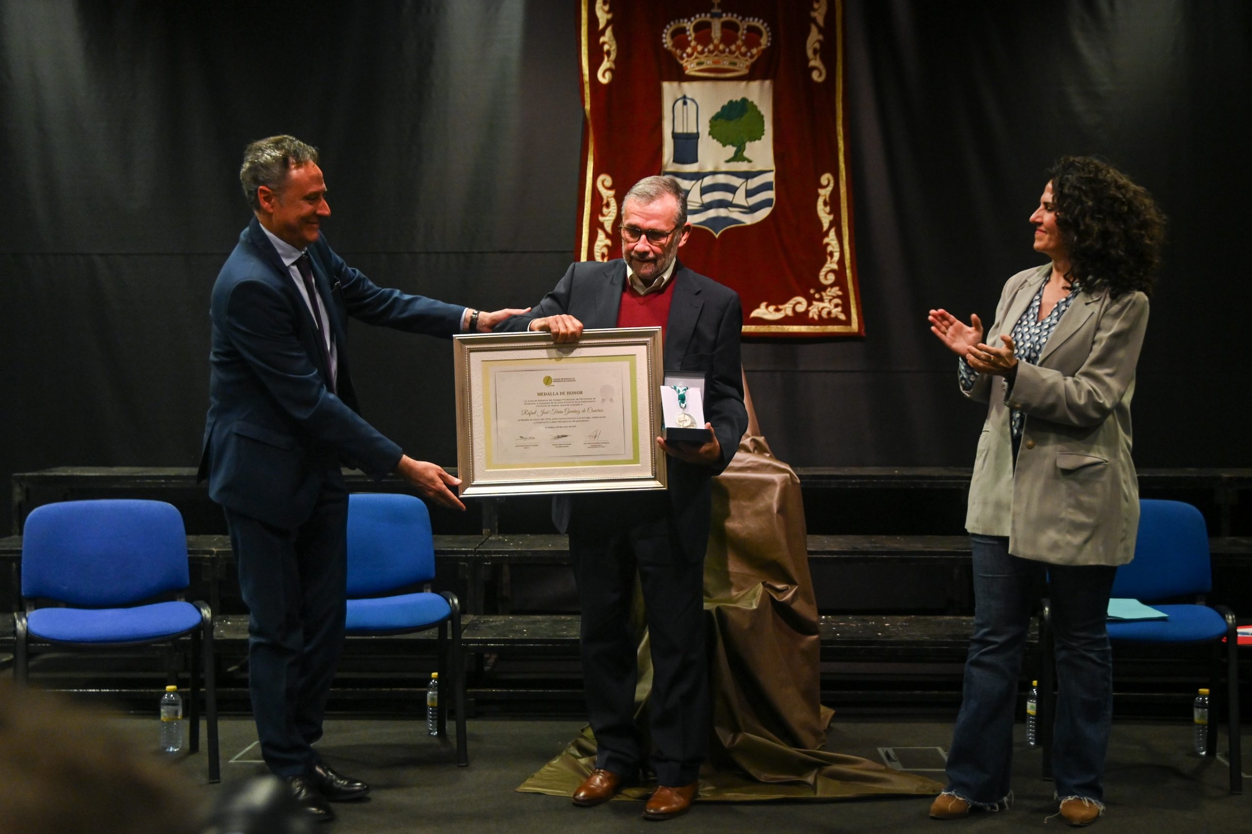 Rafael Terán con la Medalla de Honor y Diploma del CPPA junto a la vicedecana, Lorena Mejías, y el presidente de la demarcación de Huelva, Juan A. Hipólito. Foto de María Pecero
