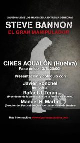 El próximo jueves día 13 de junio, a las ocho de la tarde (20,00) en los Cines Aqualon, de Huelva, se estrenará en Huelva ‘Steve Bannon, el Gran Manipulador’, revelador documental sobre una de las figuras más controvertidas de la…